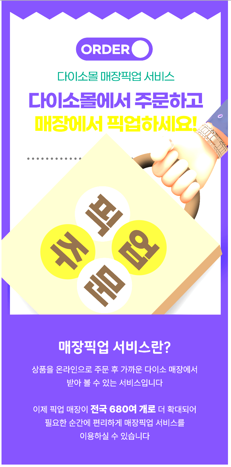 - 주문 방법: 다이소몰에서 상품을 선택한 후, 배송 옵션에서 '매장픽업'을 선택하고 원하는 매장을 지정합니다.